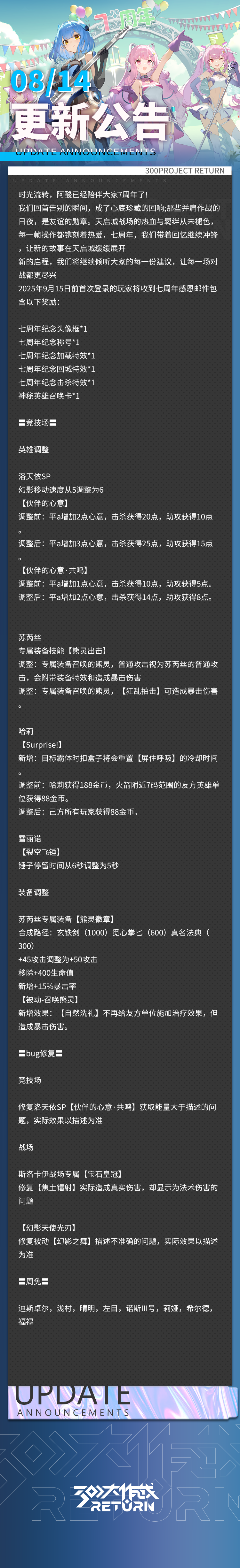 亲爱的天启城冒险者们: 奥莱科技预计于2025年08月14日08:30-11:30,对相关设施进行维护工作,届时天启城入口将关闭,您将无法登录游戏,请提前做好下线准备。 根据工作进度维护可能提前结束或推迟,请冒险者们互相转告! 以下为本次维护更新内容及近期修复/优化内容